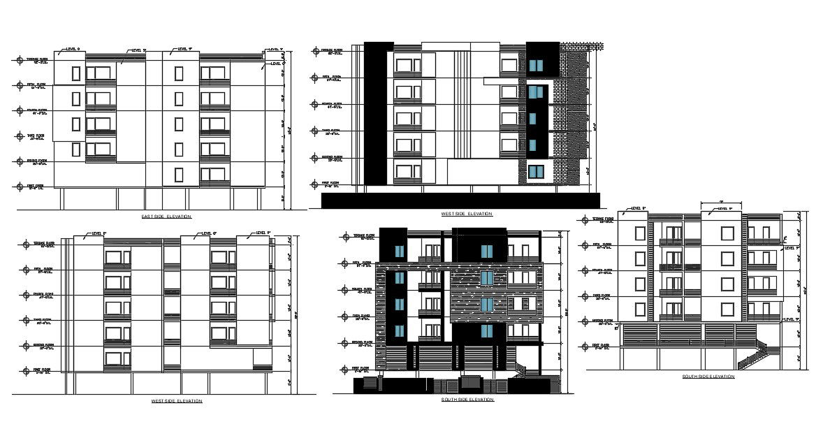 Detailed elevation of the living apartment which shows the apartment different sides of elevation like front elevation, all sides elevation, rear elevation along with building floor level details.