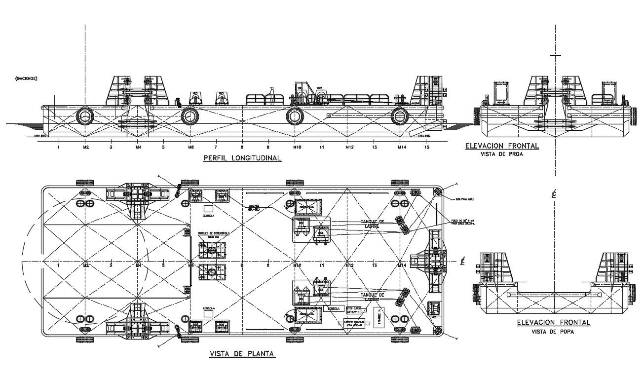 2d designing of the ship which shows different sides of elevation of a shipping boat along with section line details.