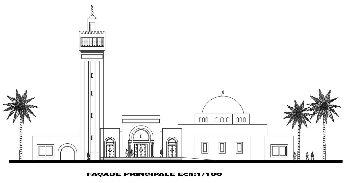 2d drawing details of the mosque which shows front elevation of the mosque with dome design details and minar design details.