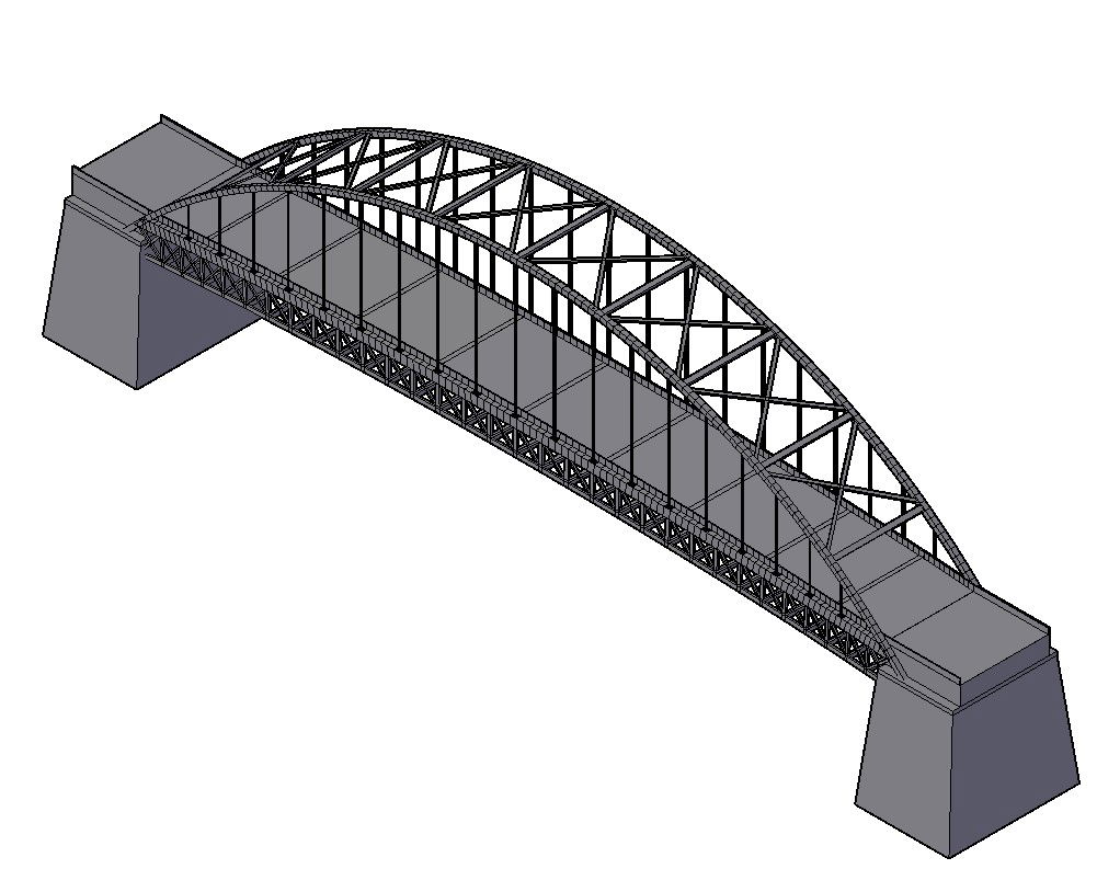 3d designing of bridge structure which shows the isometric view of the arch bridge along with hatching grid lines details.