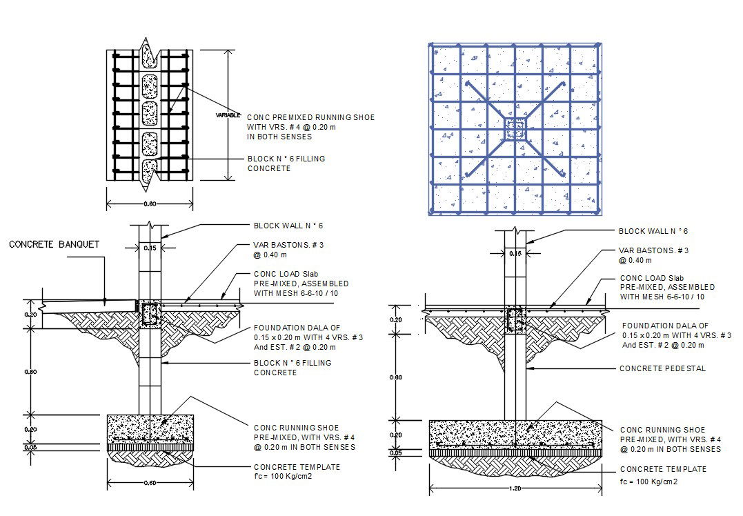 Footing Foundation Plan AutoCAD File; The design a plain concrete footing for a column of 0.15 mm x 0.20 mm carrying with a column center line plan. the foundations are structure members of column and footing detail sectional view in AutoCAD format.