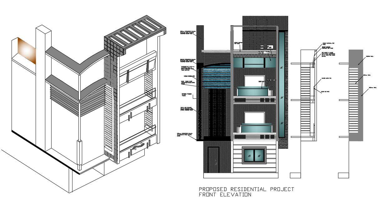 CAD design of residence bungalow which shows house front elevation detailed drawing along with an isometric view of bungalow.