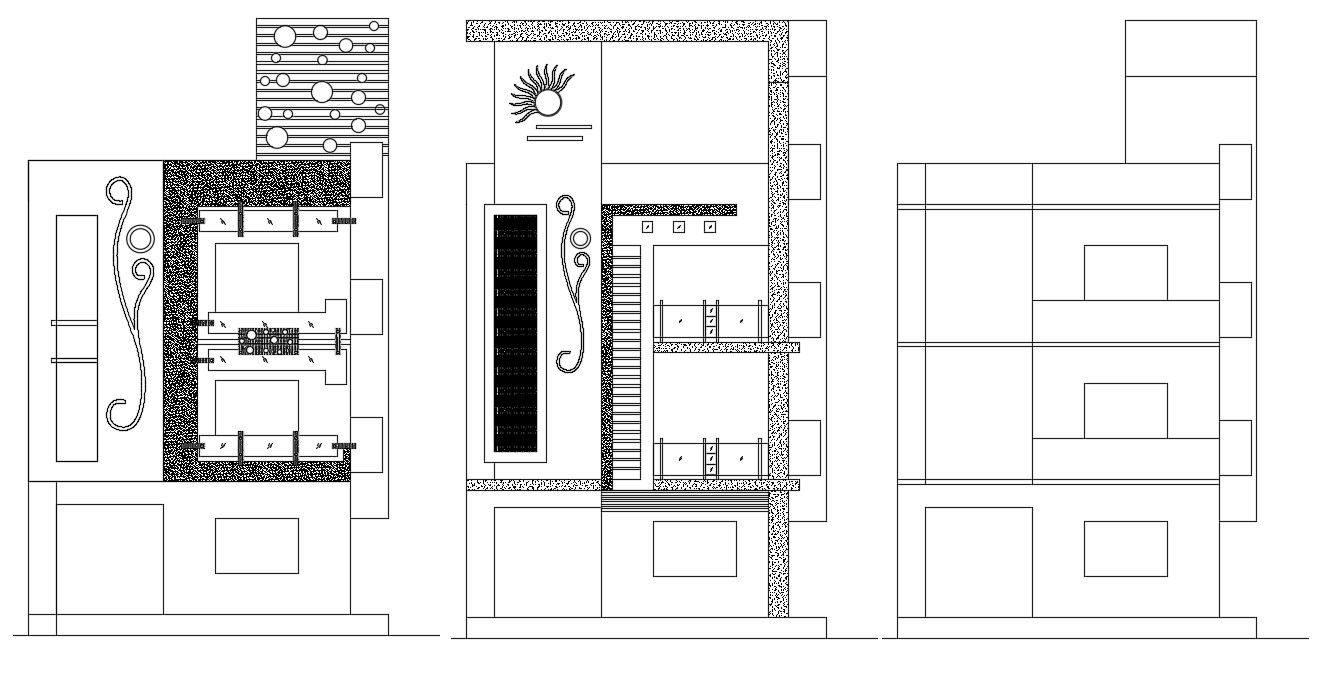 CAD elevation design of the residential house in which the apartment different sides of elevation drawing like front elevation, side elevation and rear elevation along with floor level details.