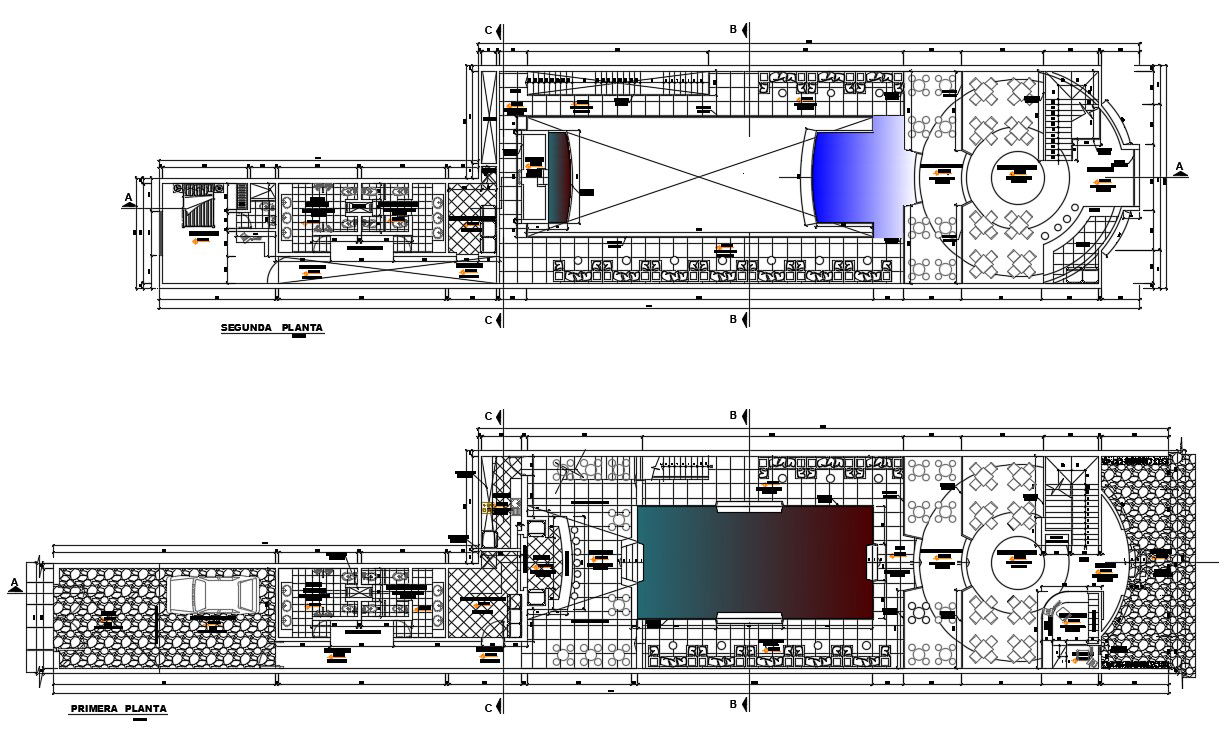 Floor plan of Disco building which shows the furniture layout design in building with restaurant, bar area, sanitary toilet design, floor level, and various other unit details.