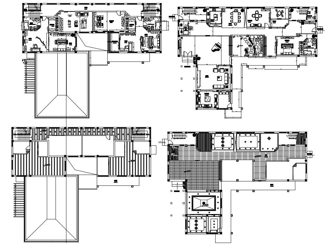 Layout Plan of residence bungalow 2d drawing which shows the floor plan details of house along with room details of the drawing-room, bedroom, kitchen and dining area, study room, sanitary toilet and bathroom details. Furniture Layout design in House also included in the drawing.