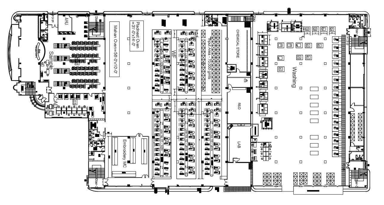 Chemical Factory Layout Plan CAD File; 2d CAD drawing of ground floor area 59800sft along with chemical storage area, work station area, washing area, bathrooms and reception area, download CAD file and get more detail about chemical factory project.