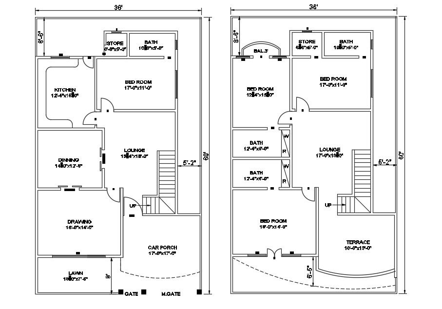 Residence House Layout Plan DWG File; The architecture layout plan of ground floor and first floor plan includes 3 bedrooms, a car porch, a drawing room, a storeroom, and a modular kitchen with measurement detail.