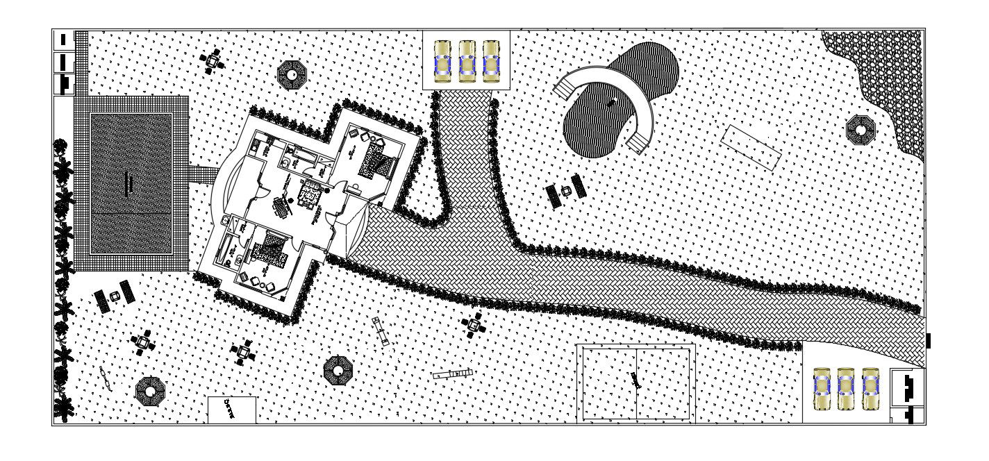 Villa Residence Layout Plan DWG File; The architecture Villa residence layout plan includes a swimming pool, small pond with bridge, entranceway, security room, 2 master bedroom, modular kitchen, drawing room, and tennis ground along with furniture detail and landscaping design. download the AutoCAD file and get more details about villa residence project.