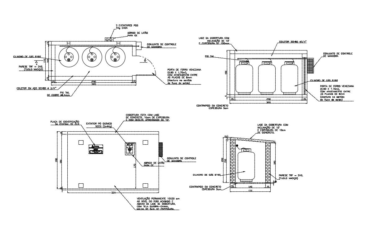 2d design of gas tank installation plan and elevation along with pipe blocks details, and various other units details of fire extinguisher cylinders details.