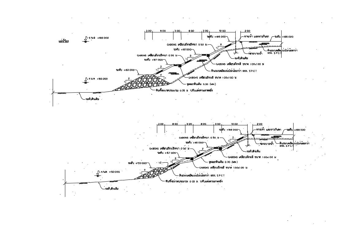2d design of earth embankment construction detailing along with slope dimension of vertical and horizontal along with embankment measurement and steps slope detailing.