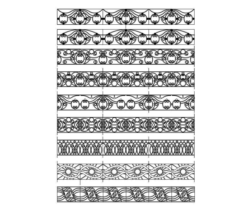 Railing Grill CAD Blocks; 2d cad drawing of iron railing grill design with different sample options. download free DWG file and use for balcony and staircase railing design cad presentation.