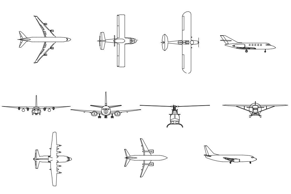 Aircraft Free CAD Blocks AutoCAD File; Find here different angle views of 2d helicopter and plane blocks. download free CAD Blocks use for airport cad presentation.