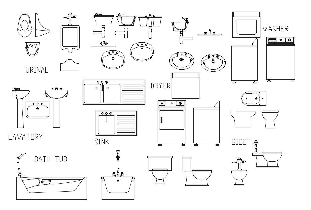 Free Sanitary Cad Blocks DWG File; 2d cad drawing of sanitary cad blocks includes a sink, bathtub, lavatory, urinal, bidet toilet, and basin. download free CAD blocks file and use it for sanitary installation CAD presentation.