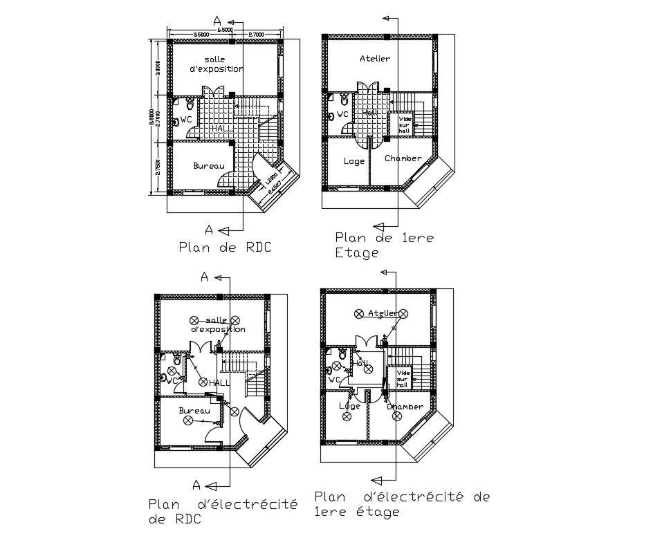 Studio design plan details along with room details of the hall, exhibition hall, sanitary toilety details. The electrical installation plan in the building also included in the drawing.