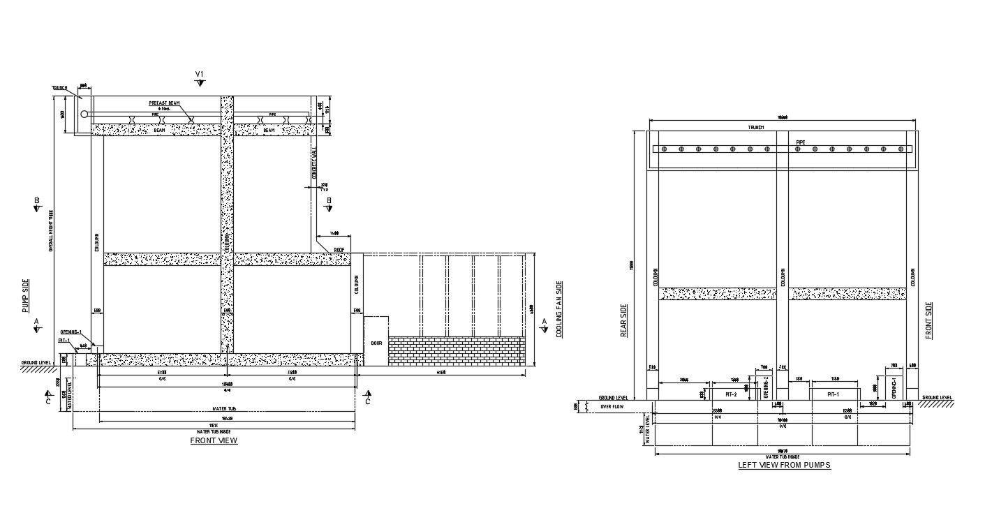 2d construction view of plumping pump blocks which shows the concrete masonry unit6s design along with dimension detailing and section line details.