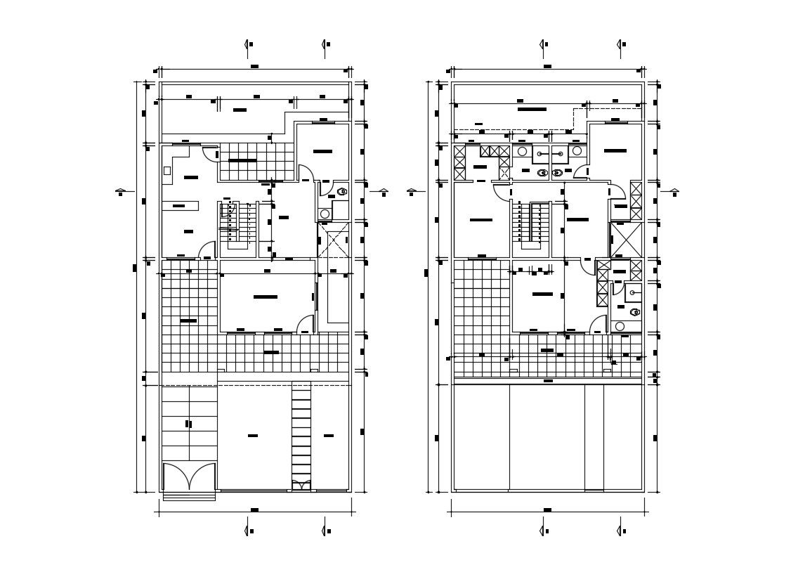 Layout plan of the house which shows the design of house along with room dimension details, section line details, floor level details, staircase details, and various other units details.