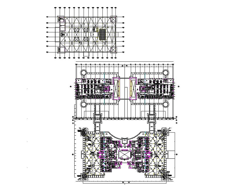 2d design of the commercial building which shows design of building plan along with dimension hidden line details. Building floor level details along with section line details.