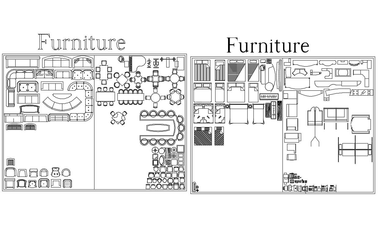 Download Various household furniture blocks which include furniture blocks detailing of table and chair, sofa set, double and single bed, and many others.