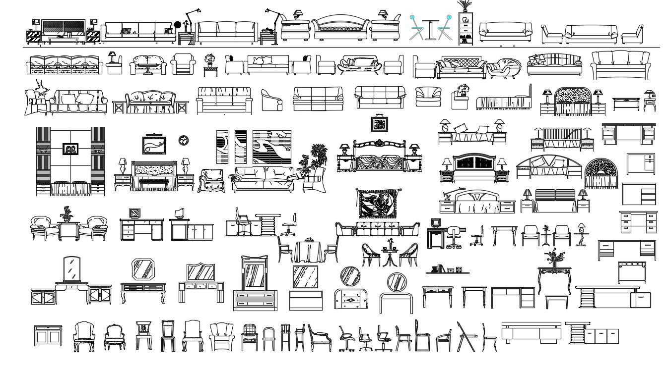 Detailed 2d drawing of Furniture blocks elevation which shows the furniture unit details of sofa-set, dressing table, table and chair, single and double bed, and many others. Download the furniture library.