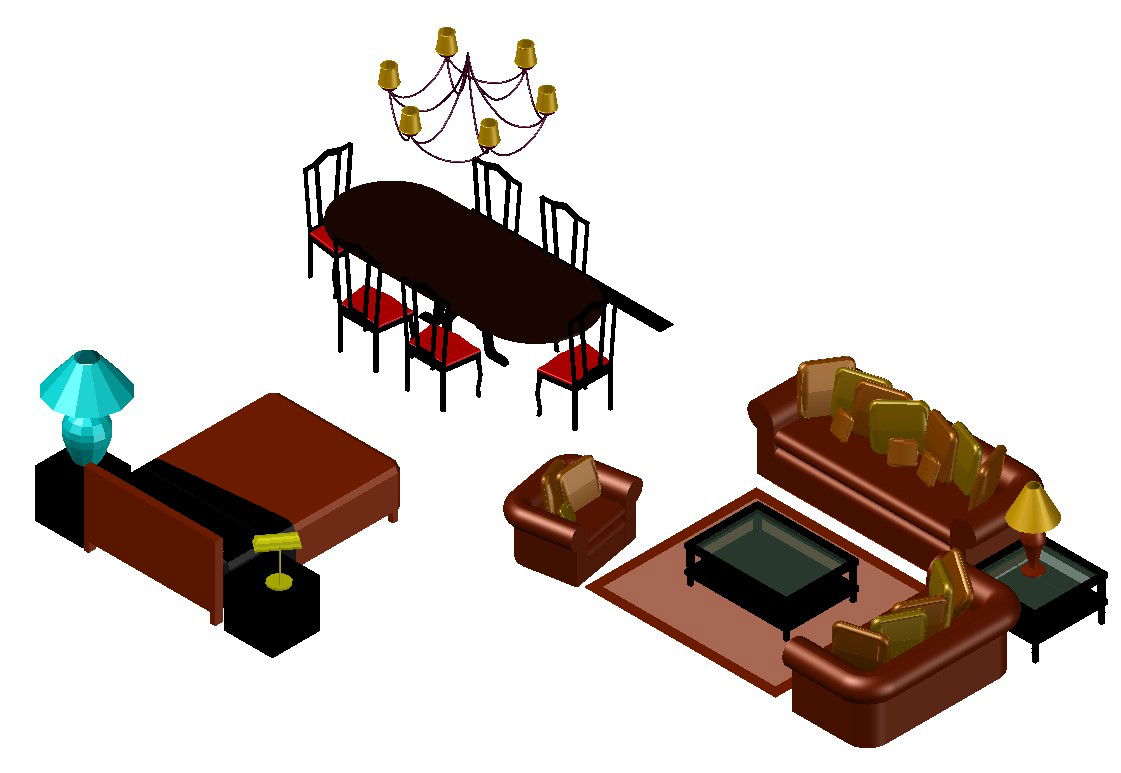Household 3d furniture blocks drawing which shows the furniture blocks details of sofa-set, dining table and chair, double bed, chandelier.