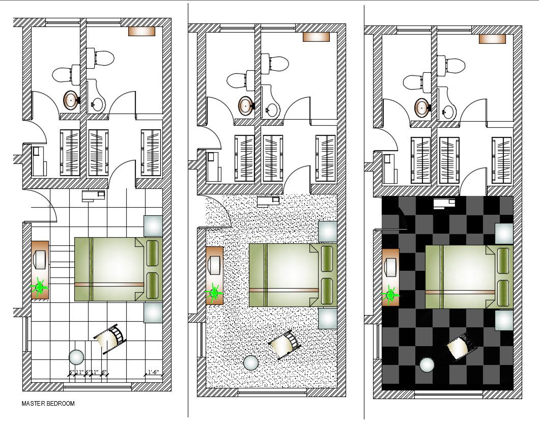 Design plan of the bedroom which shows the furniture blocks design in bedroom of a double bed, table and chair, TV unit details. Attached sanitary toilet and bathroom details plan is also presented in drawing.
