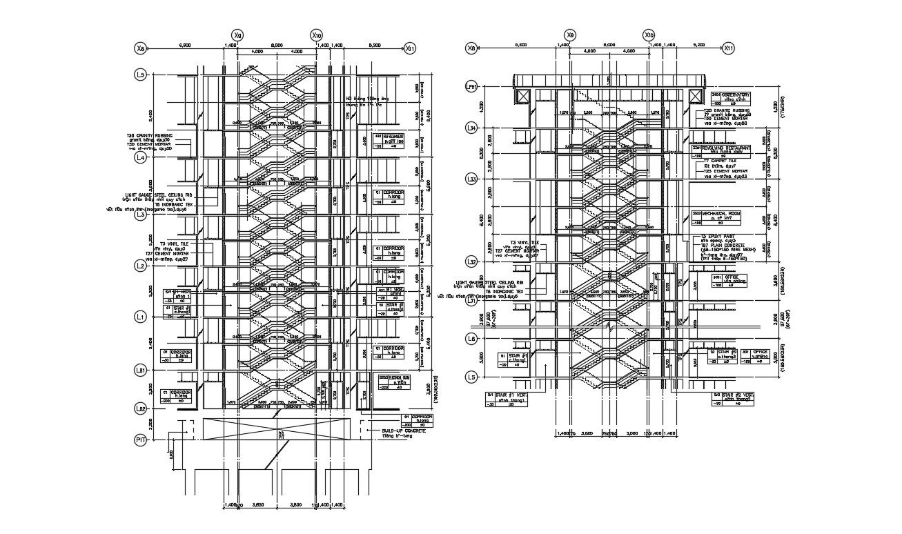 Twin Staircase Section Plan DWG file; A series of steps between different storeys of a building section plan includes twin side stair section view with dimension detail and description details.