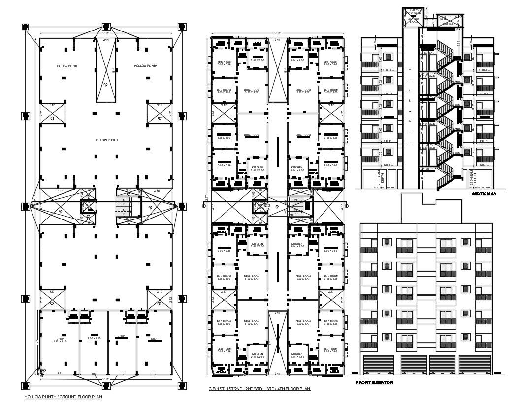 Housing apartment detailed CAD drawing which shows the terrace plan of the apartment, apartment elevation details, section view of apartment, and various other units details download the file.