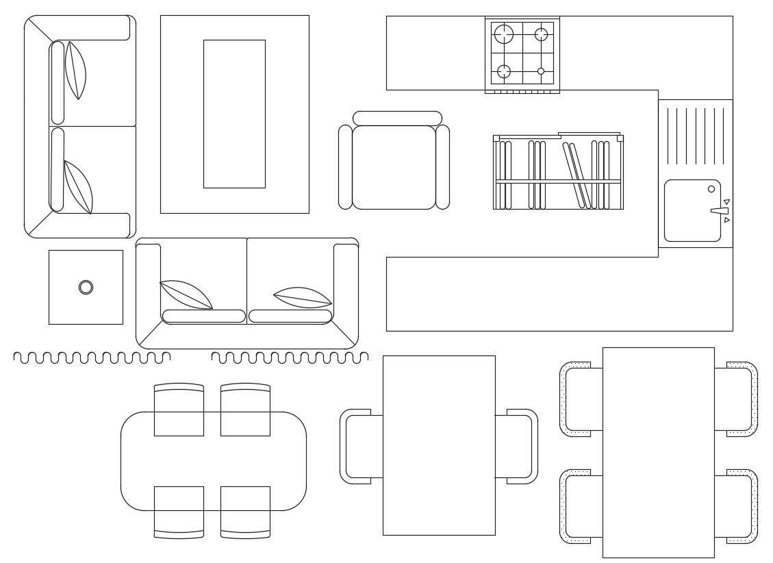CAD drawing of various furniture blocks like sofa-set, bookshelves, table and chair, and other unit details.