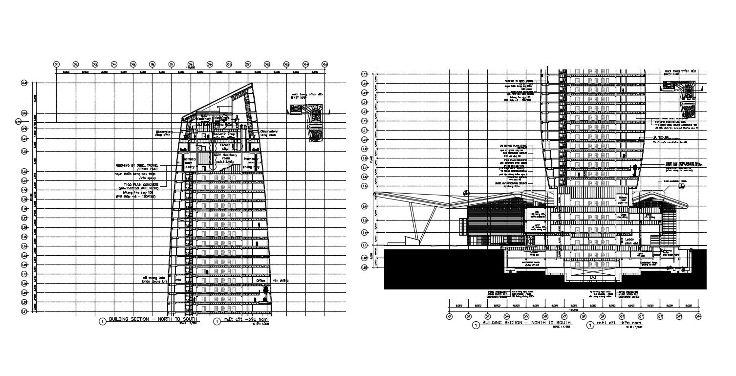 Building Section Plan AutoCAD File; The architecture corporate building AutoCAD drawing includes width and height of windows and door, dimensions of outer surfaces places, length, width and slope of existing platforms of high rise building.