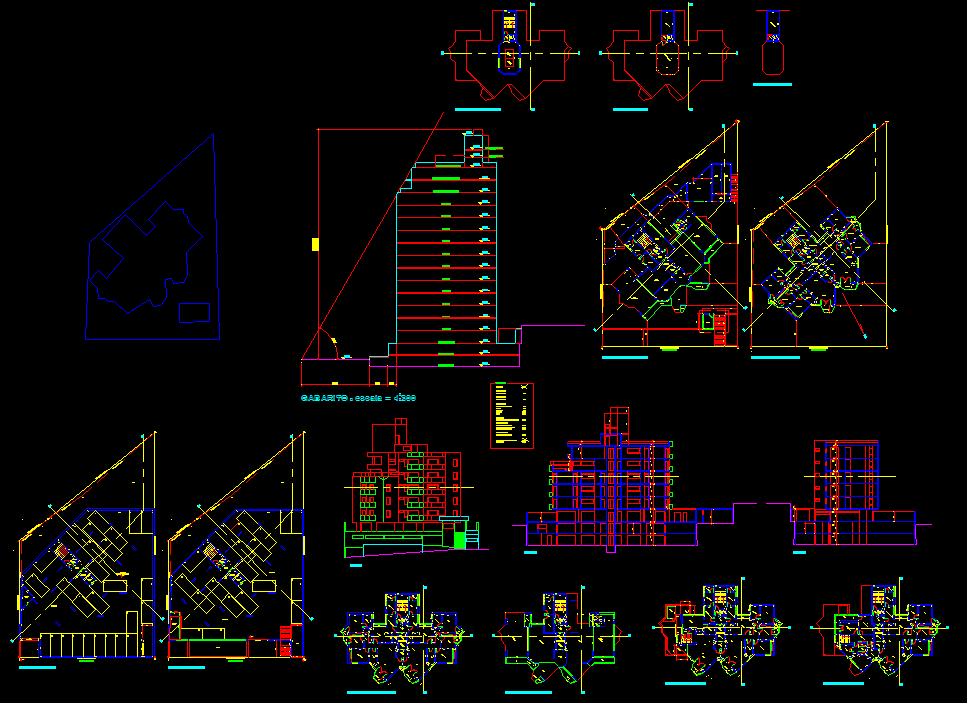 This multistorey apartment AutoCAD DWG drawing file provides an extensive architectural layout, featuring multiple floor plans, sections, and detailed dimensions. Each drawing includes accurate space arrangements with furniture placement, core areas, and circulation paths designed for functional residential layouts. The plan also highlights the building's overall structure detailed foundation and vertical planning details, making it a complete architectural representation.