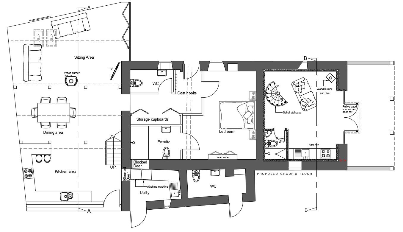 2d drawing details of housing bungalow which shows the work plan design of the apartment along with furniture layout design in the building. Section line and floor level details of house also included in the drawing.