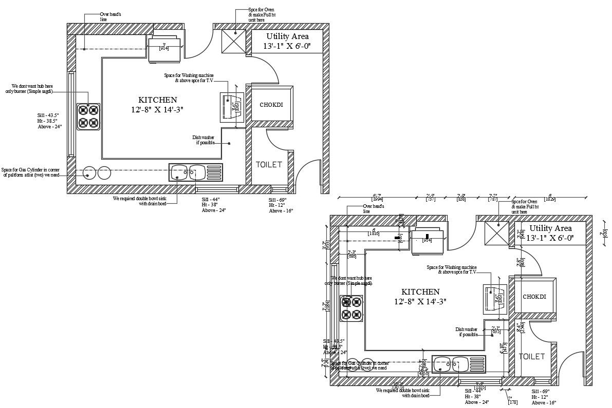 Floor plan design of kitchen which shows the kitchen design details along with kitchen furniture and automation blocks details along with kitchen stove, refrigerator blocks, kitchen sink, and many other unit details.