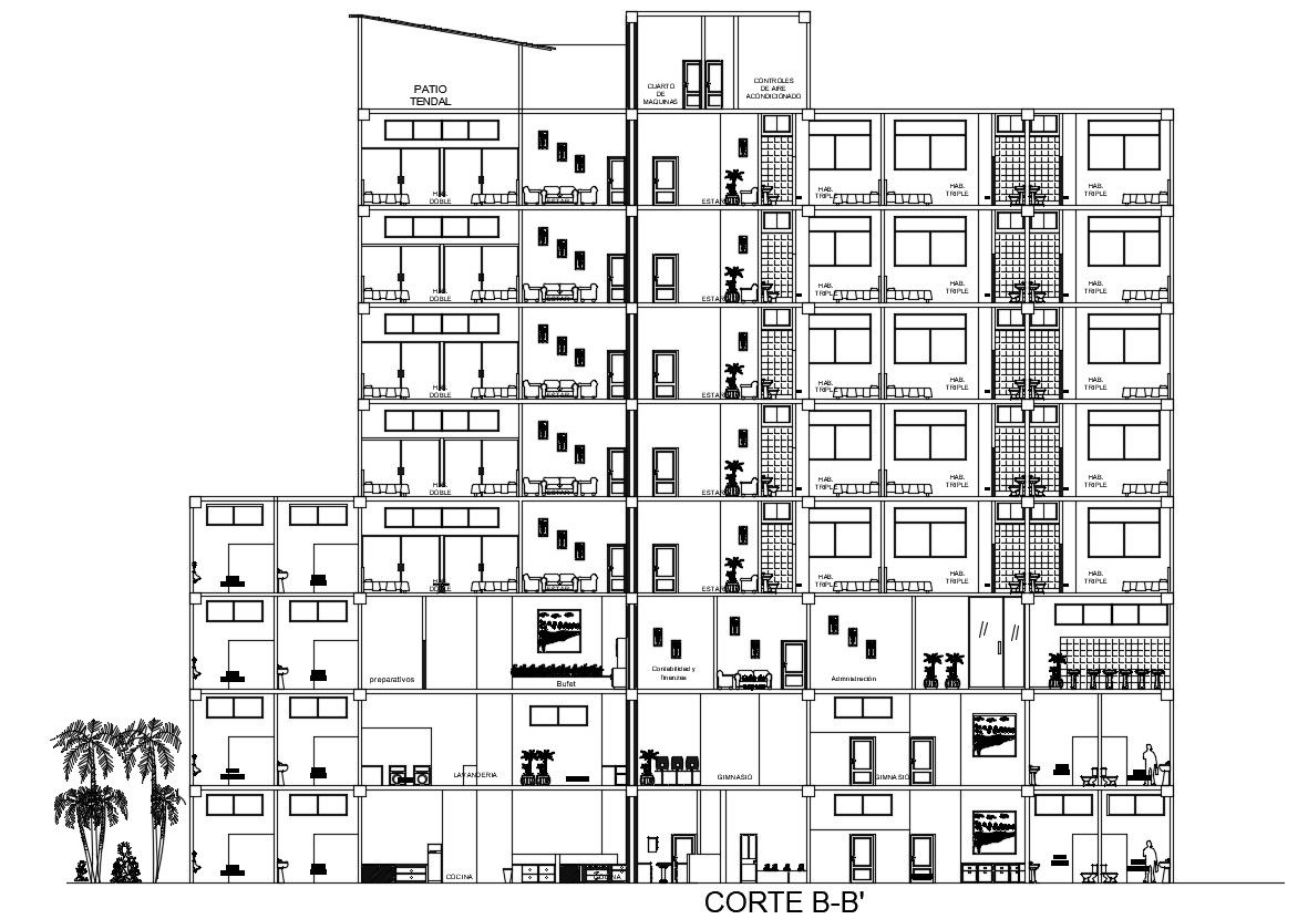 Hotel Sectional design which shows the building floor level details of building along with furniture units details.