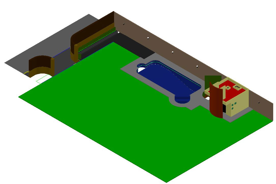 CAD drawing of club housing which shows the isometric view design of clubhouse along with swimming pol design details, compound boundary wall details, and various other unit details.
