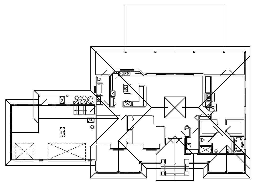 CAD plan of bungalow which shows the roof projection line details along with house design plan details and floor leveling details.