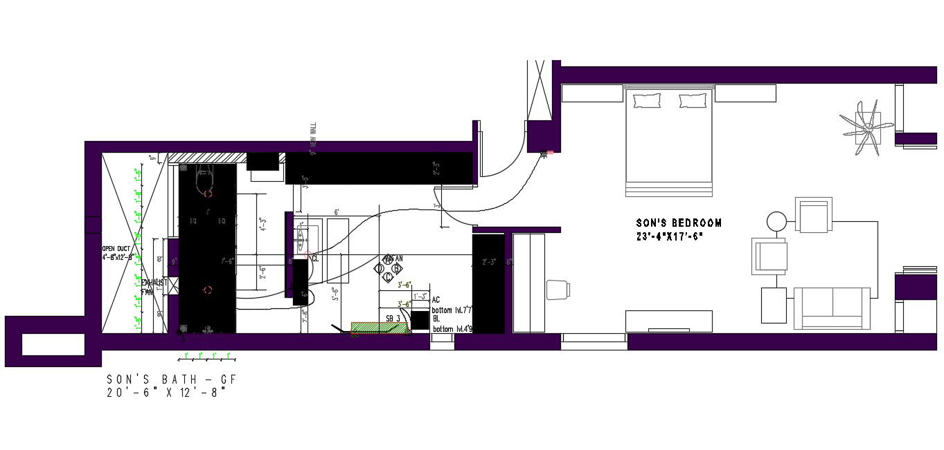 CAD drawing of bedroom plan which shows the floor plan of room along with furniture blocks details in room and attached sanitary toilet and bathroom design.