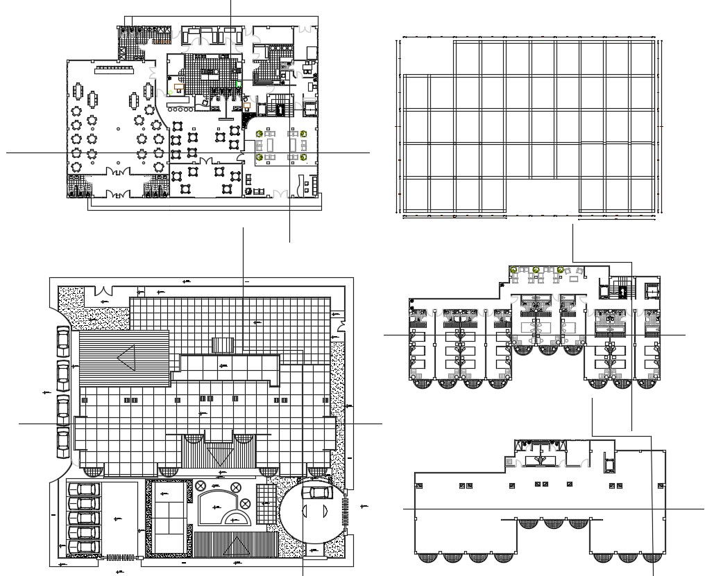 Hotel Plan AutoCAD Drawing; the architecture hotel plan CAD drawing includes bedroom floor plan, restaurant floor plan and top view with parking detail. download hotel plan DWG file with furniture details.