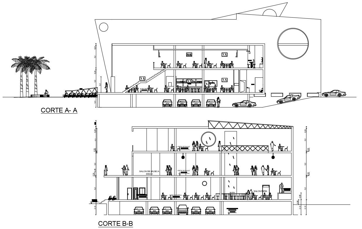 Corporate Building Section Plan DWG file; 2d CAD drawing of corporate building cross-section plan with dimension and floor level detail in AutoCAD format. download AutoCAD file of the building section plan.