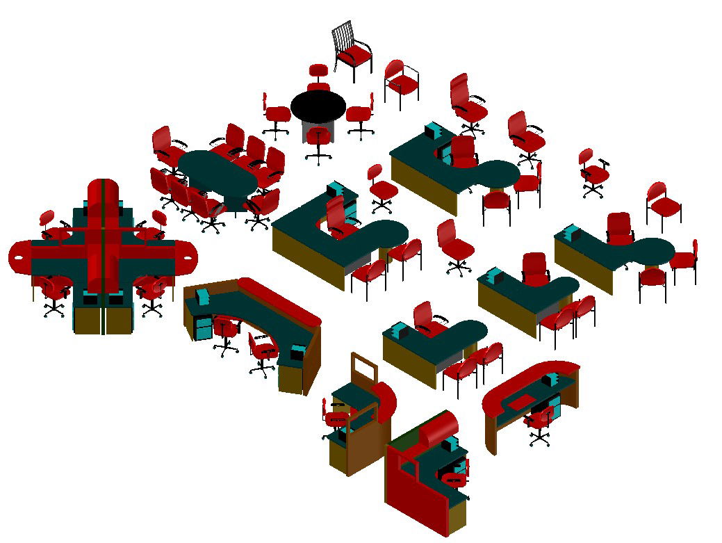 3d design of furniture CAD blocks which shows the isometric view of the table and chair along with table shape and design details.