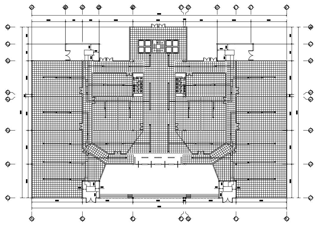 CAD drawing detailing of building roof terrace plan which shows the roof span details along with roof dimension details, roofing components details.
