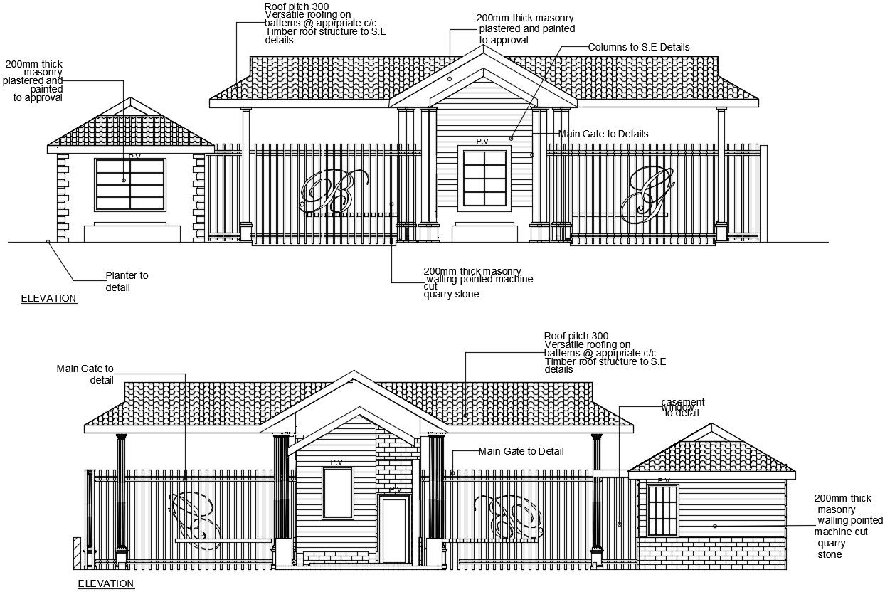 Guard House Elevation Design DWG File; 2D CAD drawing of guard room elevation design shows that inquiry window, roof texture and fencing wall design with description detail. download AutoCAD file of guard room house elevation plan.