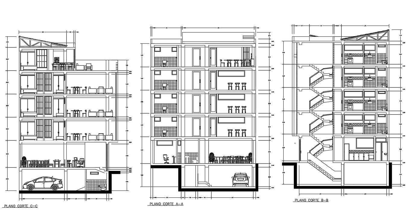 Apartment House Section Plan DWG File; 2d CAD drawing of architecture apartment with car parking building section plan includes cross-cut furniture detail and dimension detail in AutoCAD format.