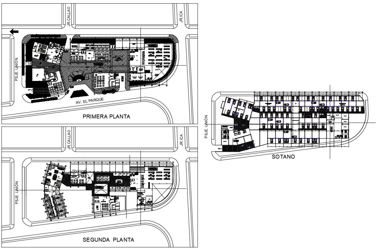 Layout plan design of hotel building which shows the hotel building design details along with hotel facilities details of restaurant area, kitchen area, hotel bedroom details, sanitary toilet details, lift elevator details, parking area details, and various other details.