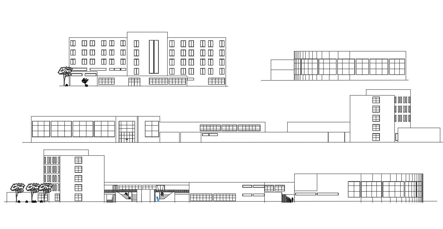 CAD drawing details of hotel building which all sides of elevation of hotel building like front elevation, side elevation, and rear elevation.