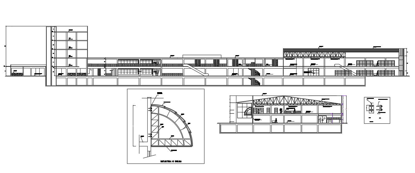 CAD drawing detailing of hotel design which shows a section view of hotels along with staircase details, floor leveling details, steel truss details, and various other blocks detailing.
