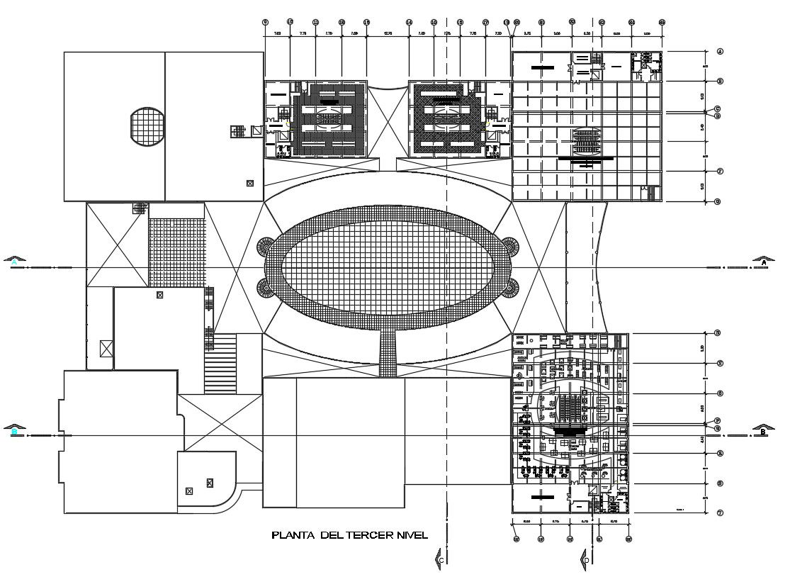 Layout plan of commercial building terrace plan which shows the top elevation of building along with dimension detailing.