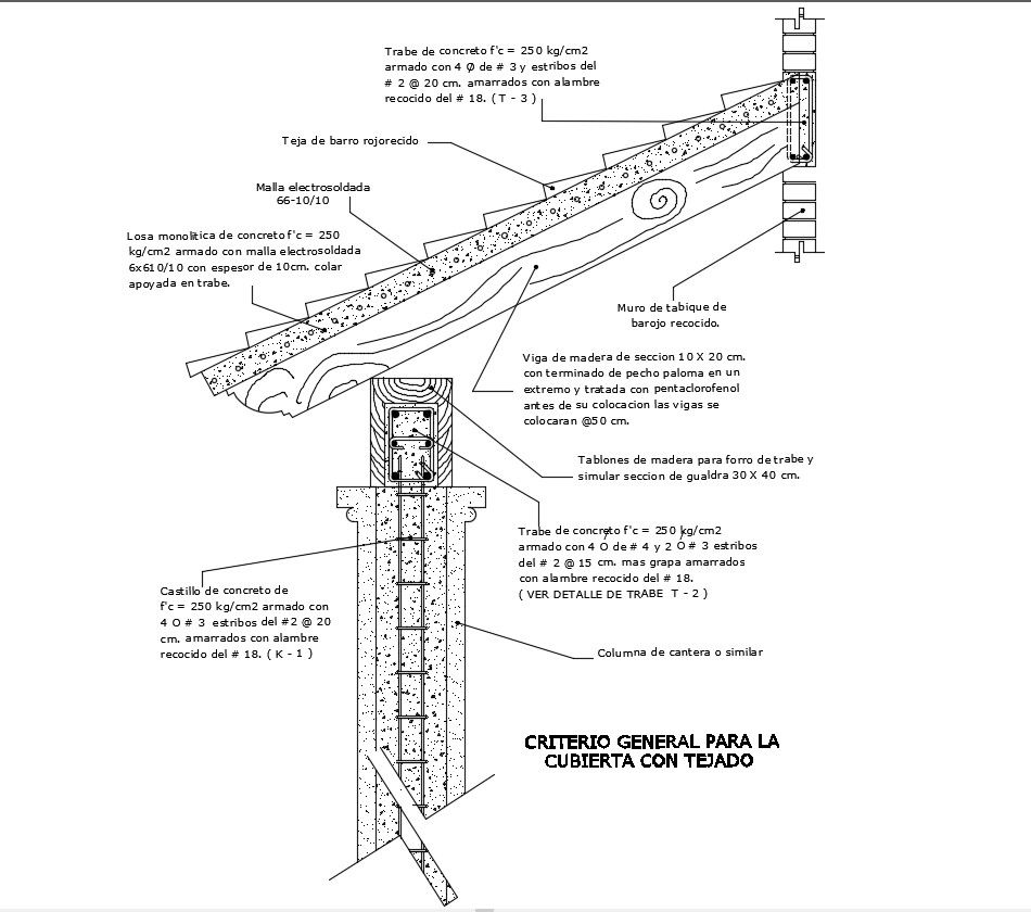 Wooden Roof Structure Plan DWG File.Wooden beam section 10 X 20 cm. With a dove chest at one end and treated with pentachlorophenol before placement, the beams will be placed @ 50 cm. Wooden planks for trab lining and simulate gualdra section 30 X 40 cm. Red clay roof tile and Welded Mesh.