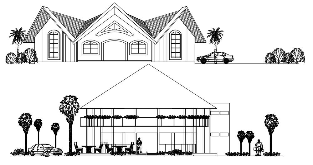 Fast Food Restaurant Building DWG File; 2d CAD drawing of fast food restaurant building elevation design and section plan with tree blocks to improve the CAD presentation.