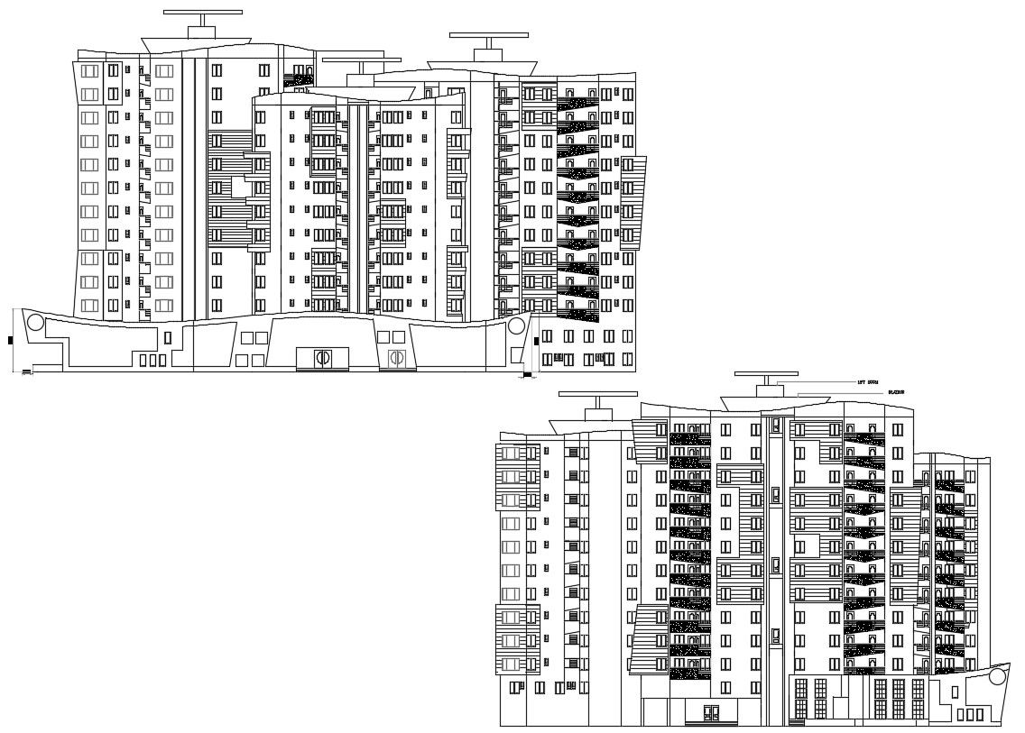 Multi-story building elevation design which shows the building different sides of elevation drawing along with floor level details.