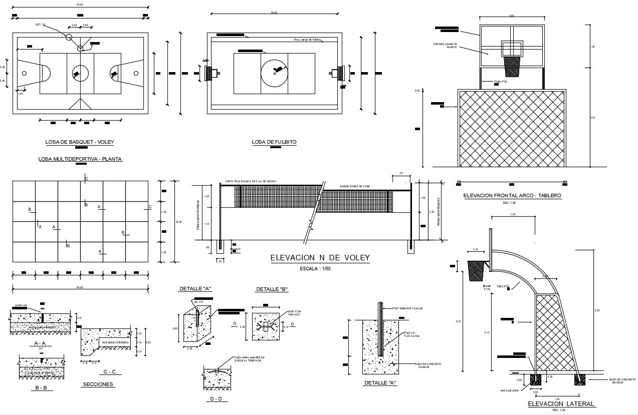 Design of basketball court ground plan which shows the ground markings and signs details along with ground marking signs, basketball net details, volleyball net details, ground dimension details, and other unit details also included in the drawing.